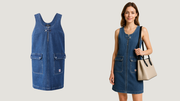 Ultra-realistic studio photo, back view of the same young female model wearing the same sleeveless blue denim dress with a loose fit. The back of the dress shows clean lines and natural drape of the denim. The model is holding or wearing the same stylish handbag. She is turning her head slightly over her shoulder to show her profile, creating a dynamic yet elegant pose. White or light background, soft professional lighting. Photorealistic style, ideal for an online store product listing. Focus on the fit of the dress from behind and overall styling.