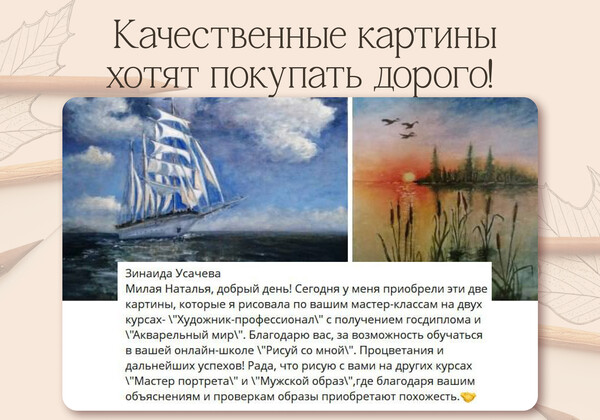Вкладывая 5-6 часов ежедневно, вы получите за свой труд от 5.000 рублей😉Давайте посчитаем: рисуя в спокойном темпе по одной картине 5 дней в неделю, доход составит 100.000 рублей ежемесячно.