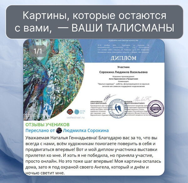 Например, Людмила Сорокина приняла участие в выставке и получила диплом. Призовое место не заняла, работа осталась у автора. И это к лучшему😉