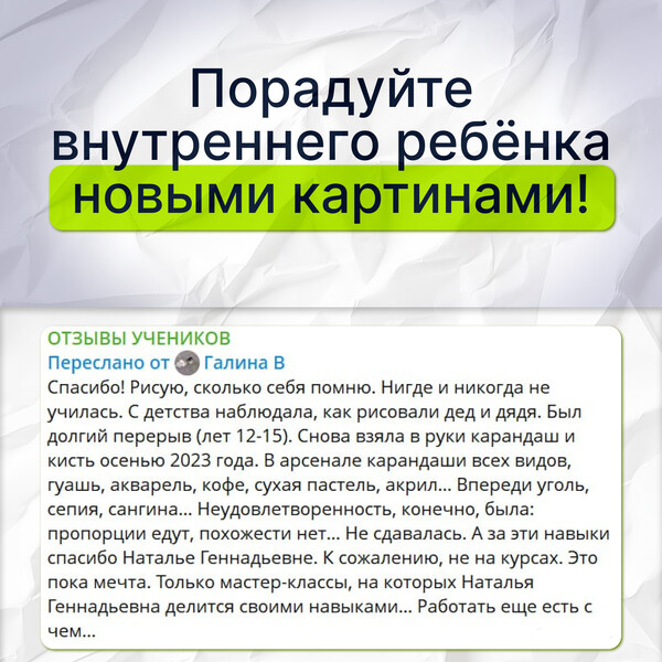 Ученица Галина всю жизнь рисует, но только после знакомства со школой «Рисуй со мной» у неё начали получаться реалистичные работы. Авторский алгоритм Натальи Коневец помогает всем, без исключения.