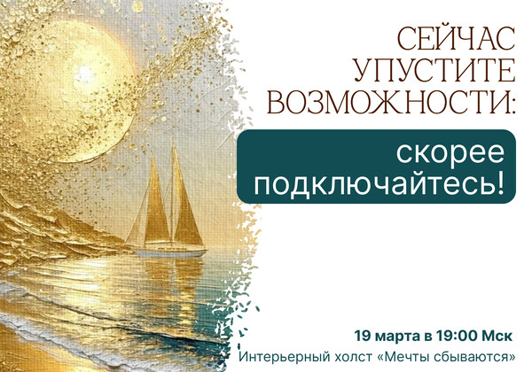 19 марта в 19:00 Мск — прямо сейчас пишем авторский интерьерный холст «Мечты сбываются» с «вау-эффектом»